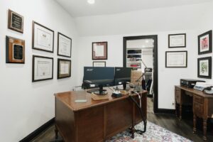 What sets this property apart is its seamless integration of historic charm and modern convenience. Every fixture has been thoughtfully selected and handmade by different artisans, adding an extra layer of personalization and care to the renovation. The wood-burning fireplace and walk-in vault serve as reminders of the property’s rich history, while the custom wine nook and home office provide all the necessary amenities for working or relaxing in style.